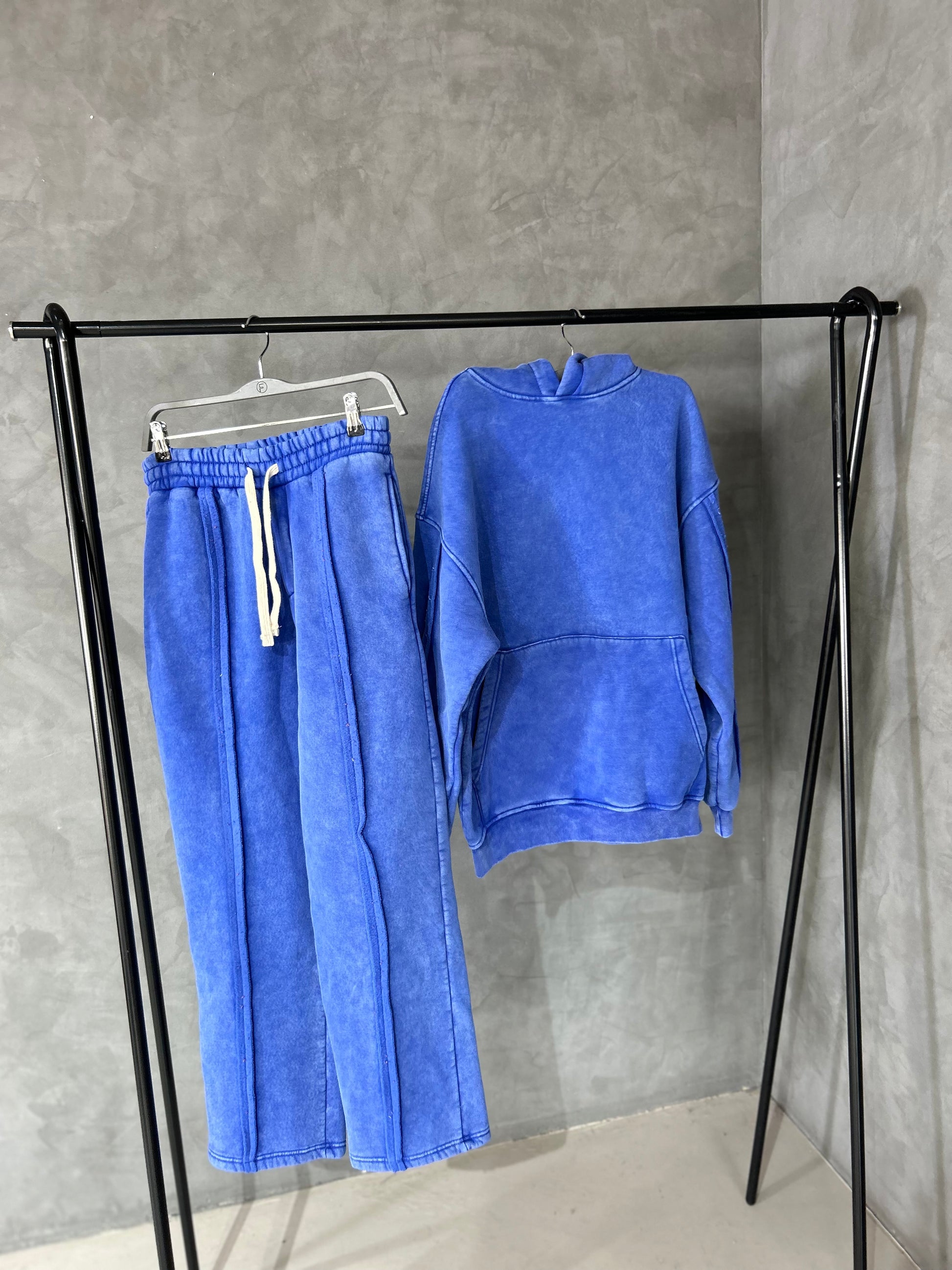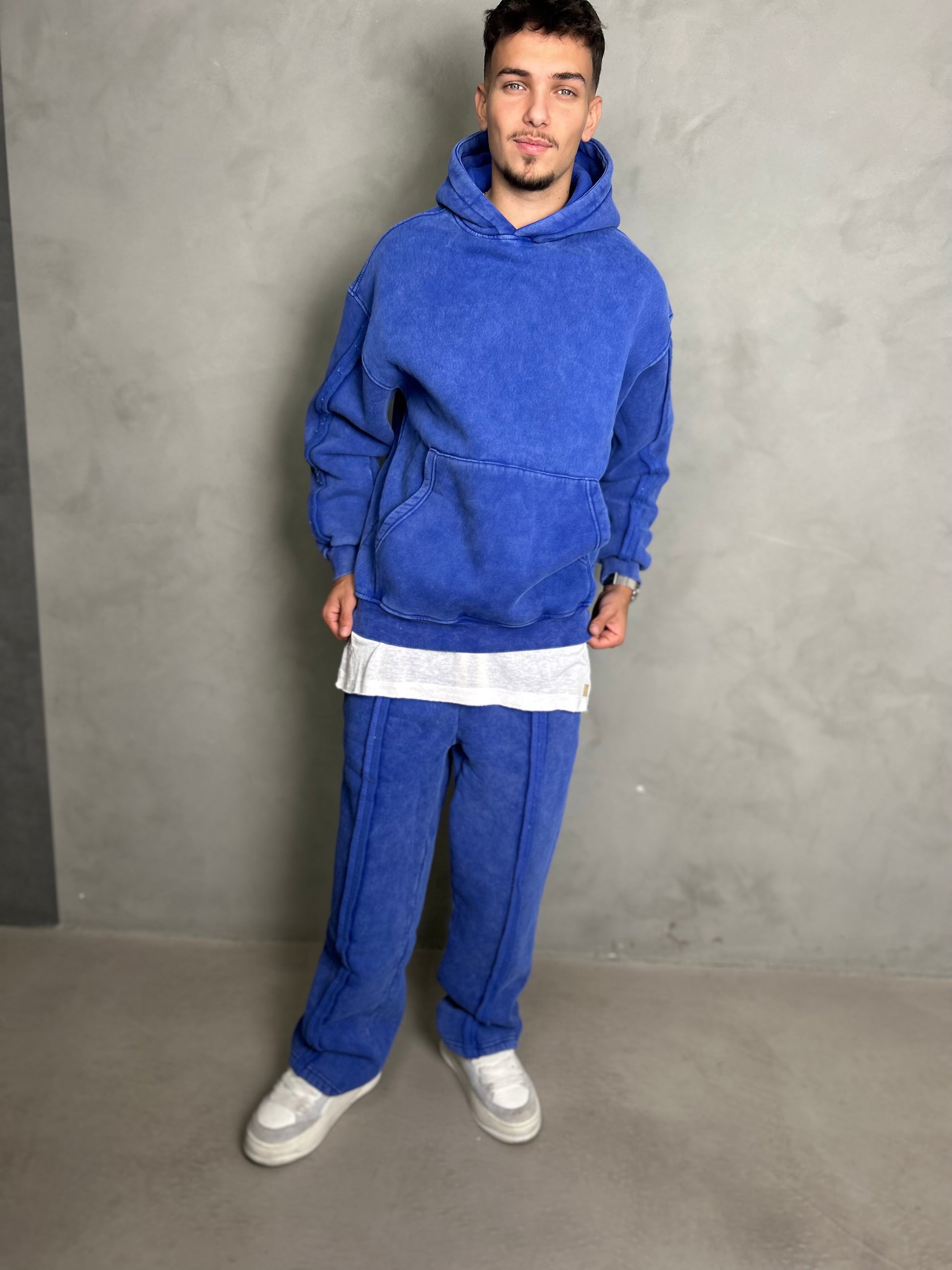 מכנס רחב בגזרת אוברסייז בצבע כחול משופשף עם פסים בצדדי המכנס